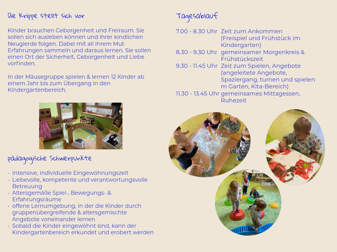 Mäusegruppe (Krippe)                   Katzengruppe (Kleinkindgruppe)                    Bärengruppe
